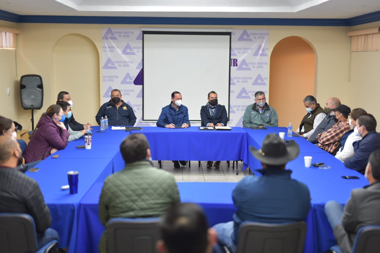 Acuña, Coah., 11 de enero de 2022. – El Alcalde Emilio de Hoyos Montemayor se reunió con miembros del Consejo de la CANACO, con el propósito de escuchar propuestas del sector comercial de Acuña y analizar actividades que pudiesen impulsar conjuntamente para reactivar este ámbito.