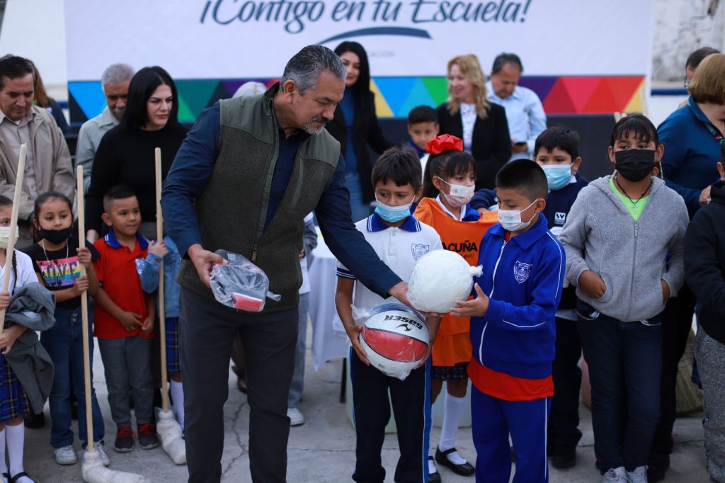 Acuña, Coah., 18 de octubre de 2022. – Con la presencia de regidores del cabildo y directores de diversas dependencias, se realizó el programa «Contigo en la Escuela», con la entrega de material de limpieza y deportivo para los 155 alumnos de la Escuela Primaria Anselma Vitela de Bósquez.