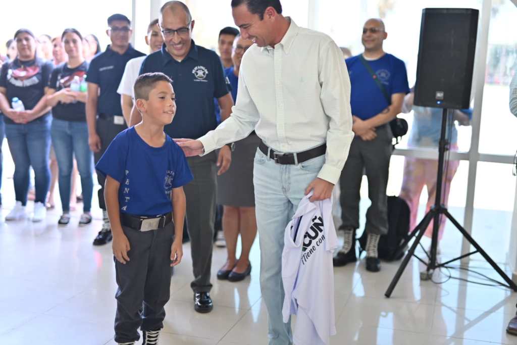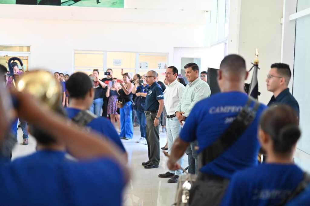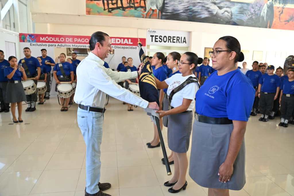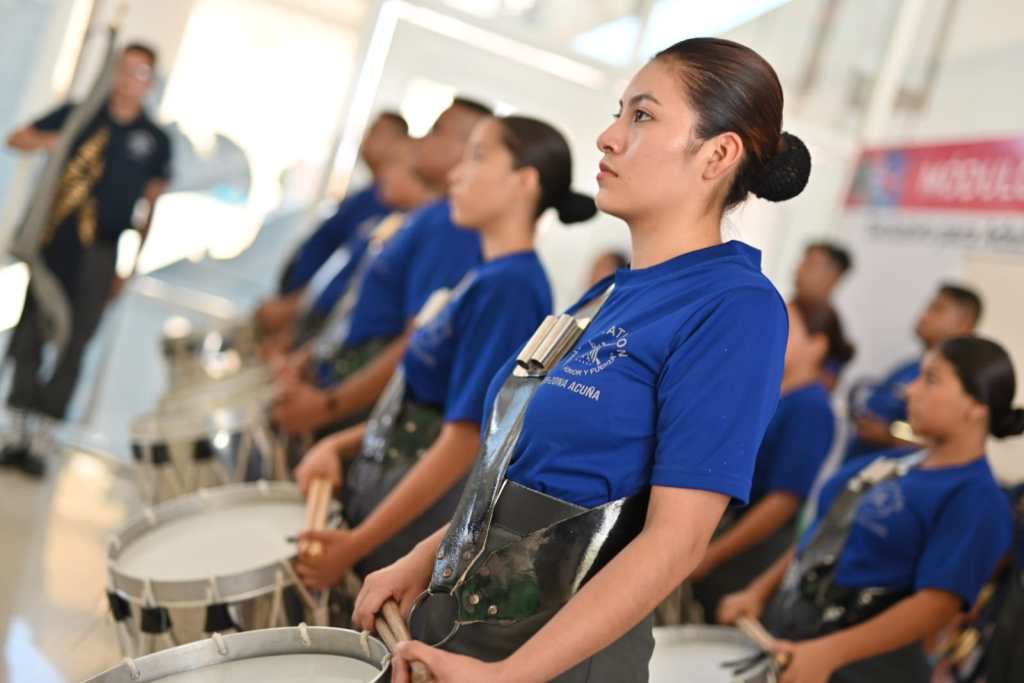Los jóvenes presentaron una muestra de su preparación en coro y banda de guerra, e hicieron entrega al presidente municipal de dos playeras distintivas con frases alusivas a la identidad de Acuña y al Gobierno Municipal: «Por amor a Acuña» y «Acuña tiene con que».