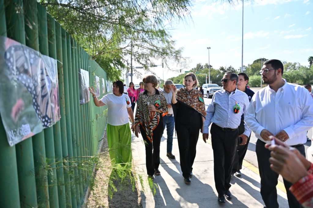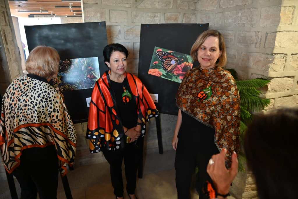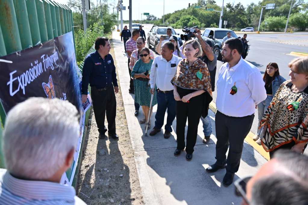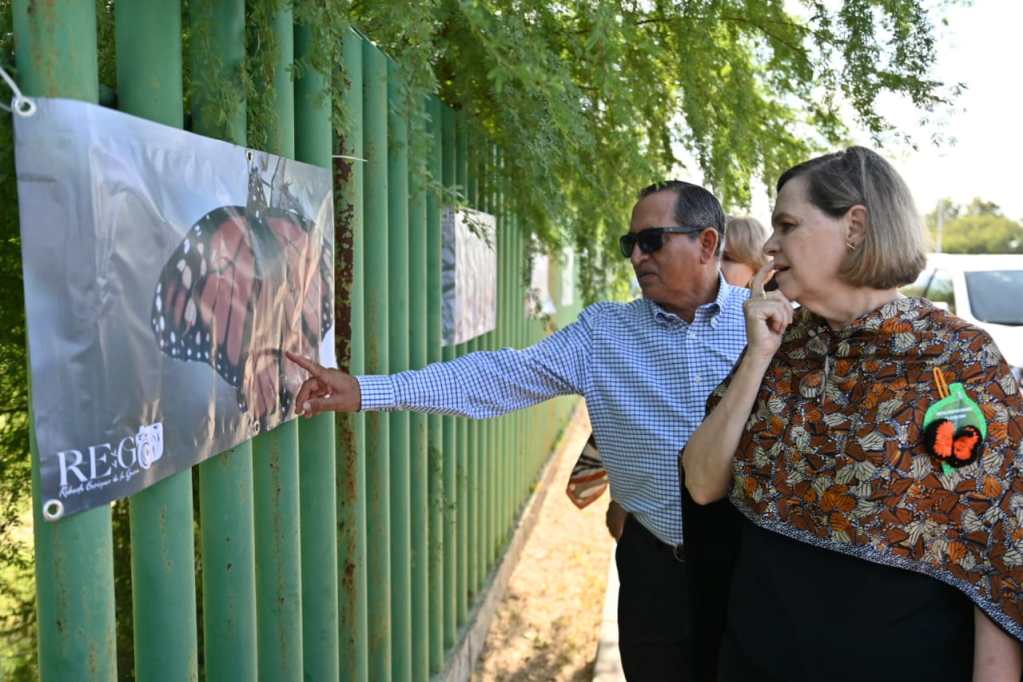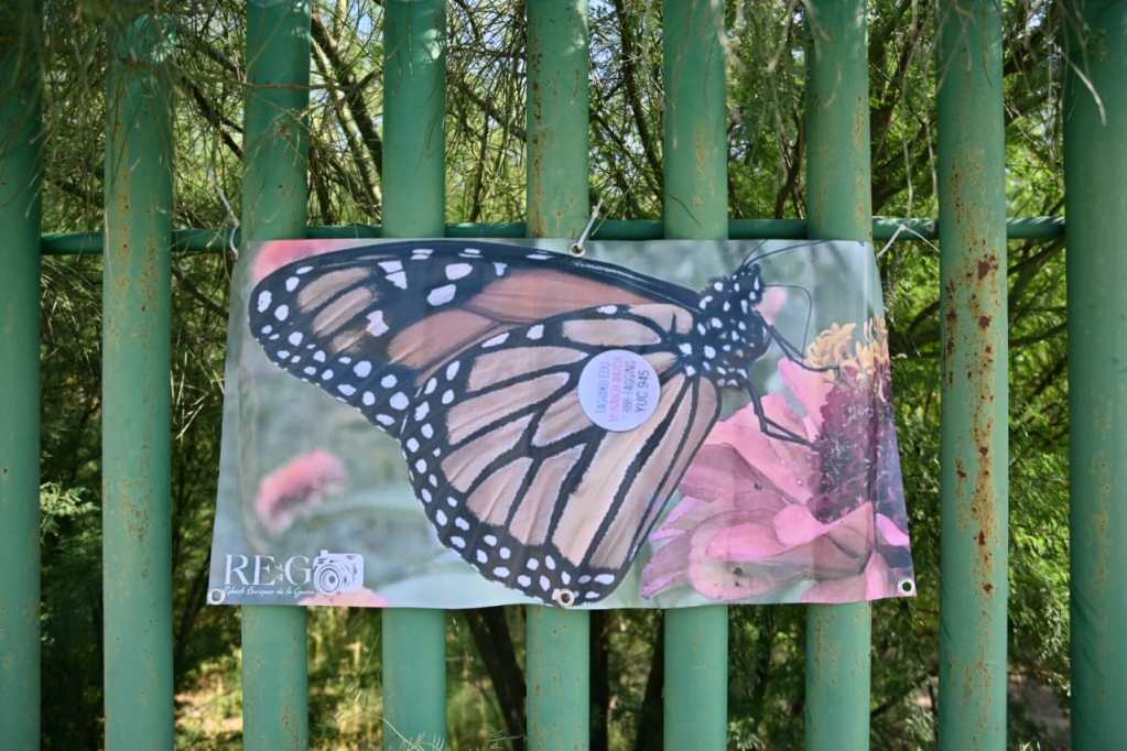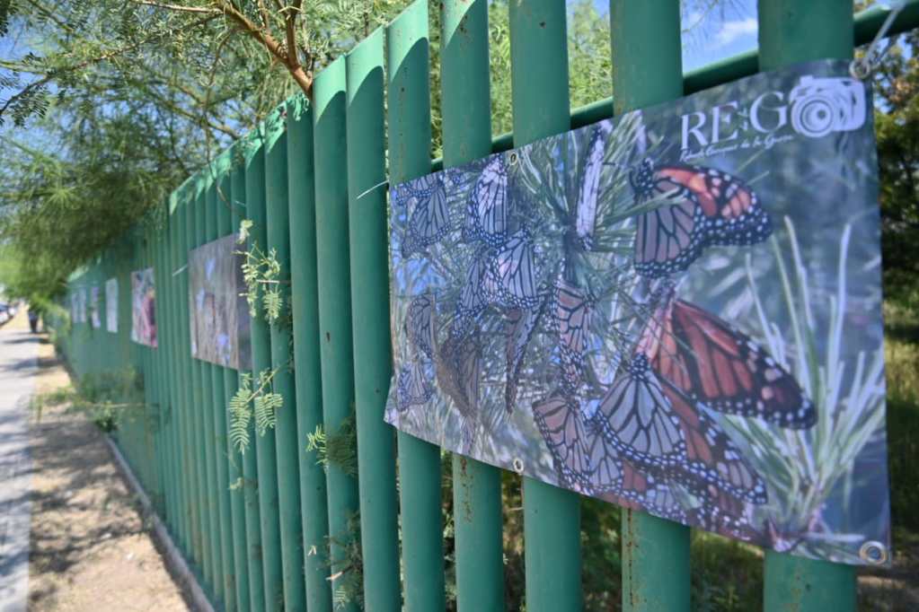 Posteriormente, sobre la cerca perimetral del parque Braulio Fernández Aguirre, fue exhibida otra colección de carteles de la mariposa monarca, que a lo largo de los años ha documentado el voluntario del Correo Real y subdirector técnico de la Comisión Internacional de Límites y Aguas CILA.