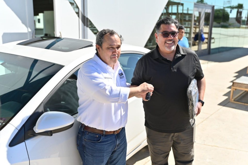 Estoy motivado para continuar pagando a tiempo, expresó Eduardo Luis Maldonado Pedroza, feliz ganador del auto Cavalier 2024, blanco de lujo, al recibir de manos del director de Egresos Municipales Virgilio de Hoyos Hernández, llaves y título del vehículo.