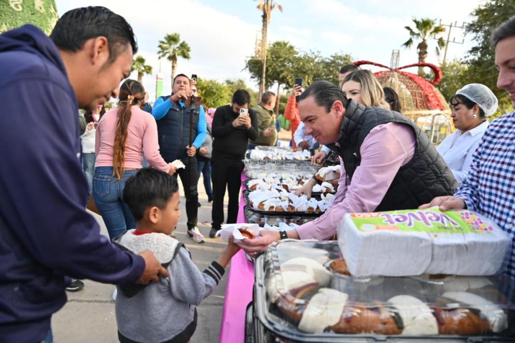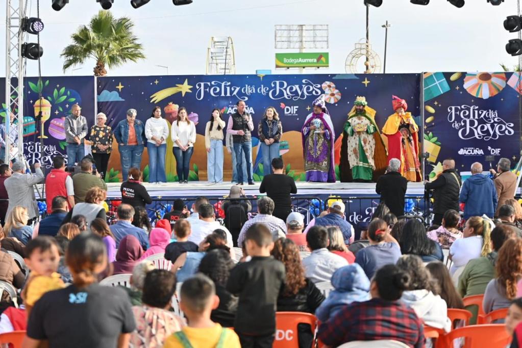 Ante miles de niños y niñas, el alcalde Emilio De Hoyos y la presidenta honoraria del DIF Acuña, Yahaira Romero de De Hoyos personalmente hicieron entrega de la tradicional rosca de reyes y chocolate caliente para las miles de familias que acudieron a la Macroplaza; a la entrada, en las taquillas los niños recibían un bolo y un boleto gratuito para participar en rifas.