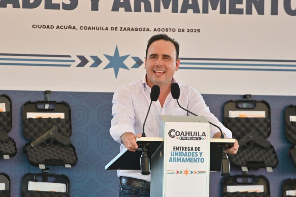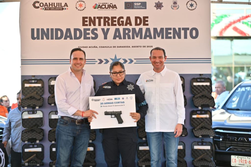 Acuña, Coah; 26 de agosto de 2025.– El alcalde Emilio De Hoyos Montemayor, acompañado del gobernador del estado, Manolo Jiménez Salinas, encabezó la entrega de 17 nuevas unidades y armamento para la corporación de Seguridad Pública Municipal, con una inversión municipal superior a los 16.6 millones de pesos.